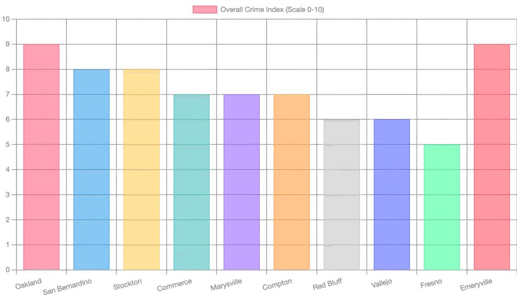 This bar chart provides an opinionated overall crime index for the top 10 most dangerous cities in California, on a scale of 0 to 10. Cities like Oakland and Emeryville, despite their differing primary crime issues (violent vs. property), score highest due to the intensity and frequency of incidents. Other cities like San Bernardino, Stockton, and Compton consistently rank high due to persistent challenges with violent crime and socioeconomic factors. This index offers a general comparison of the perceived overall safety challenges in each city, aiding in a quick understanding of their relative risk levels.